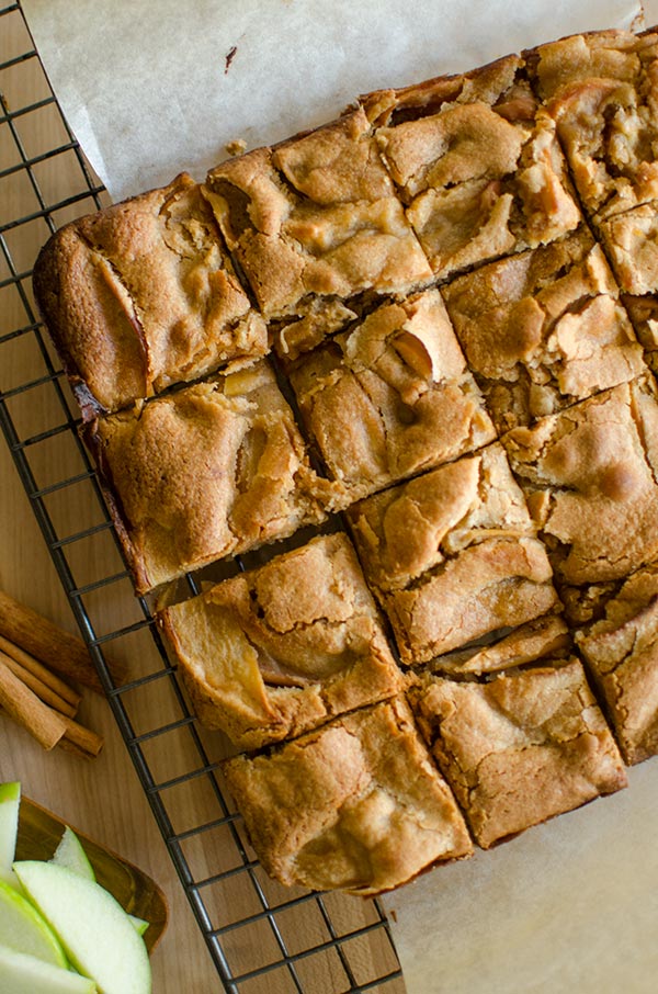 When you’re making the batter, it may seem as though it’s too thick, but once you fold in the apples, it will loosen up. The apples also release moisture as the bars bake, so you in the end they are super moist and delicious with the perfect cracked top you expect to find in blondies.