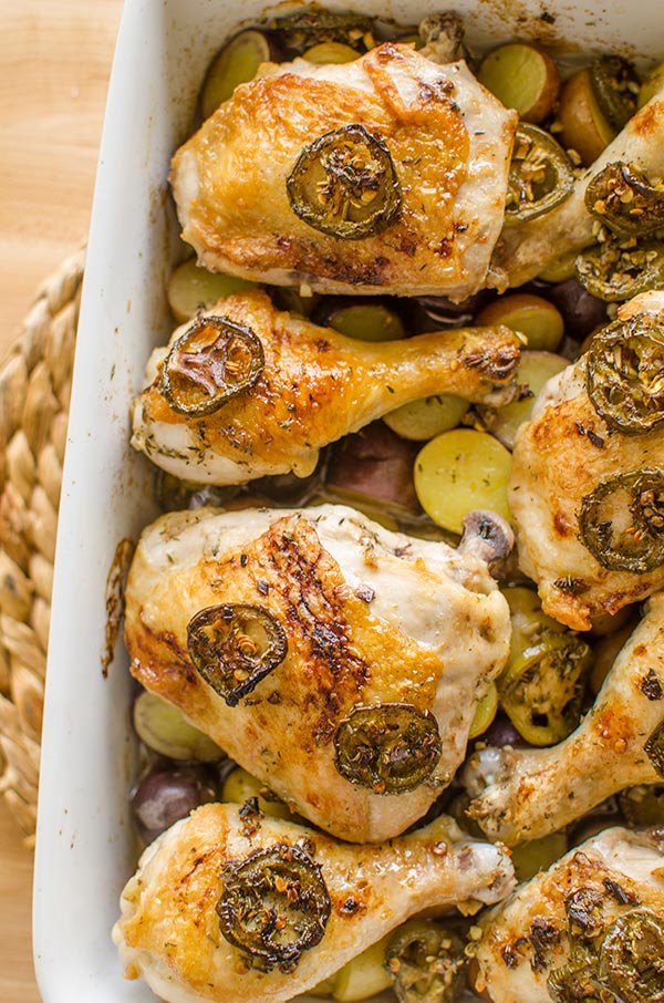 • Arrange chicken on top of potatoes, pour jalapeno mixture on top. Roast in the oven for 30-35 minutes or until chicken is fully cooked and potatoes are done.