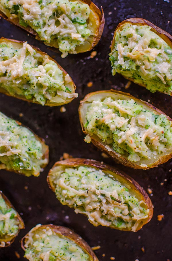 The filling is a combination of the cooked chopped broccoli, potato flesh, sour cream, aged Gouda and green onions, which then gets added back to the potato skins, topped with extra cheese and thrown back into the oven for another couple of minutes until the cheese is all bubbly. Talk about magic!