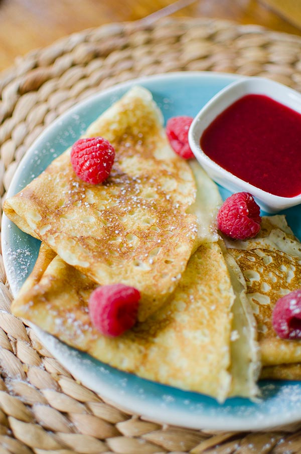 A simple recipe and foolproof technique for making French crepes with a recipe for fresh raspberry sauce.
