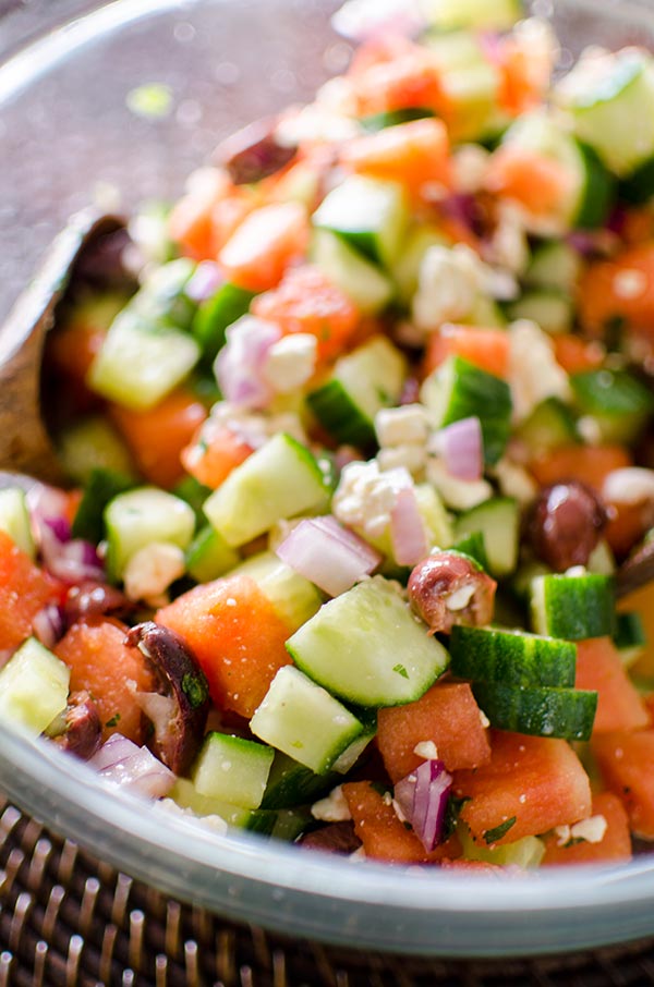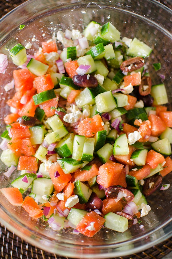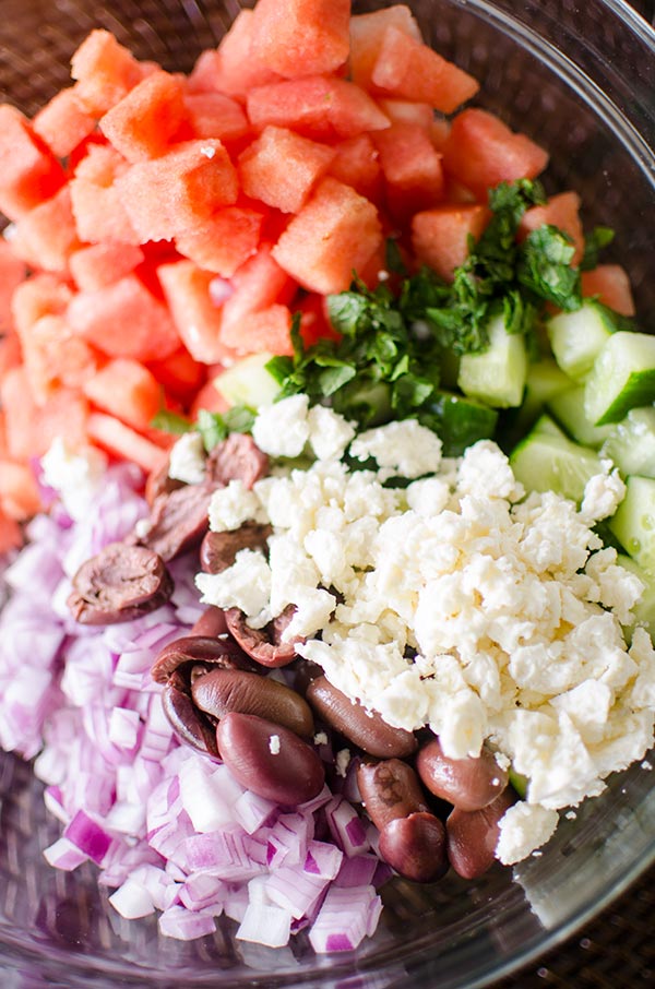 But those aren’t my only memories of watermelon. In Greece, every meal is finished with a plate of fresh watermelon. When I saw this recipe for Greek Salad, I knew that I had to try it.