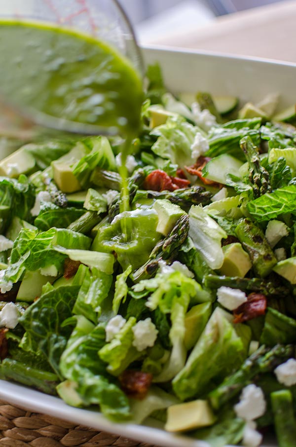 Today, it’s this fresh salad with sweet and grassy grilled asparagus, tangy goat cheese, savoury sun dried tomatoes and finished off with a bright basil vinaigrette (that doesn’t taste like pesto–please don’t add garlic!).