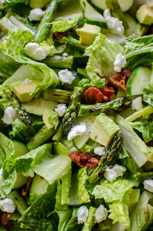- Meanwhile, in a large bowl toss romaine with cucumber, green onion, avocado, sun dried tomatoes, goat cheese and cooled, chopped asparagus.