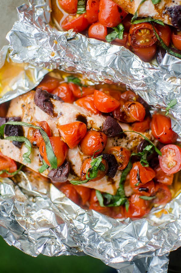 - Open foil packages, drizzle with balsamic vinegar and sprinkle with basil. Serve immediately.