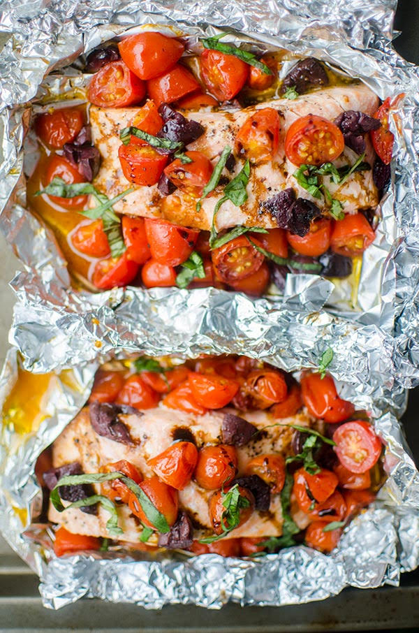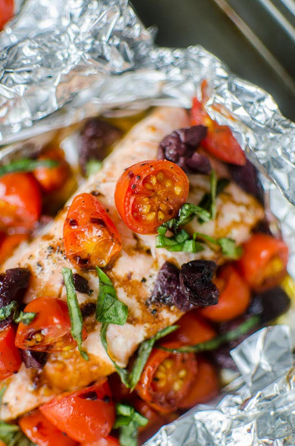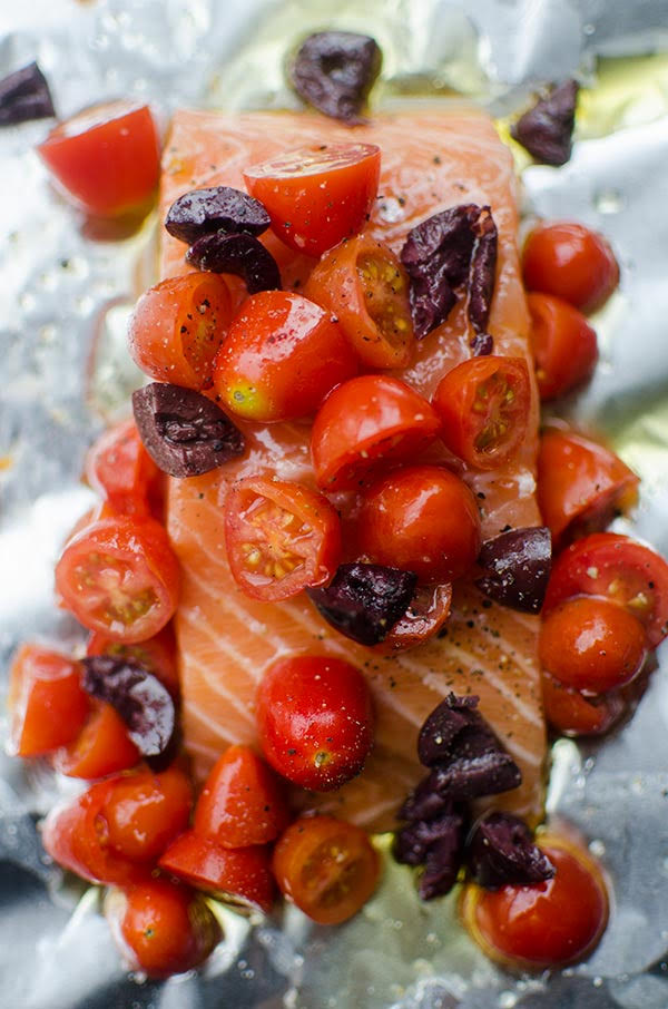 - Cut 4 large rectangles of aluminum foil. Place salmon fillet on each piece and evenly distribute tomatoes and kalamata olives. Drizzle evenly with olive oil, make sure there is olive oil underneath the salmon to avoid the skin sticking to the foil. Sprinkle evenly with salt and fresh pepper. Fold foil and crimp the edges to seal the packages.