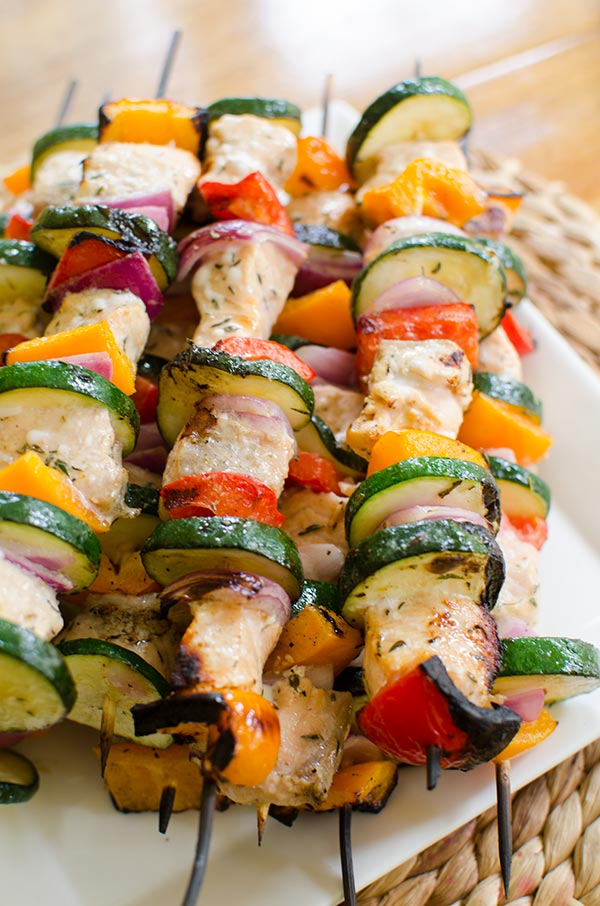Grilled salmon skewers with zucchini, onion and bell peppers are marinated in an olive oil, lemon juice and dried thyme marinade.