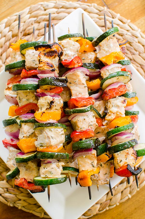 These grilled salmon skewers are a basic recipe but I find a lot of people are intimidated by grilling fish. It’s so easy to overcook and can fall apart right on the grill. Trust me, I’ve made both of those mistakes before. The trick to making salmon skewers (or skewers of any type) is to be very selective with the kinds of veggies you are grilling along with your protein. Because salmon cooks quickly, I opted for onion, zucchini and bell peppers because I knew they would cook in the same time as the fish.