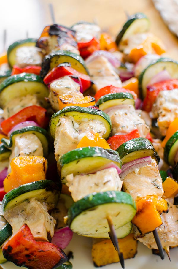 Grilled salmon skewers with zucchini, onion and bell peppers are marinated in a olive oil, lemon juice and dried thyme marinade.