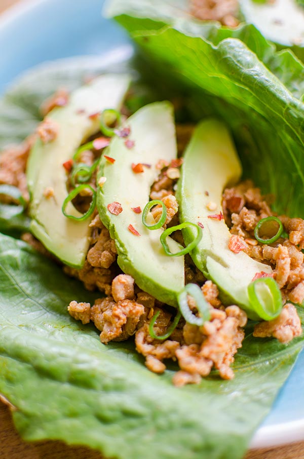 There are just a few ingredients in these lettuce wraps–no hoisin or sriracha. The star of the show is the smoked paprika along with grated fresh ginger and lime juice which add a depth of smoky flavour with hints of spice and zing to these lettuce cups. Add an onion, a few cloves of garlic and you’ve got yourself a super quick dinner! I like to top mine with avocado and scallions.