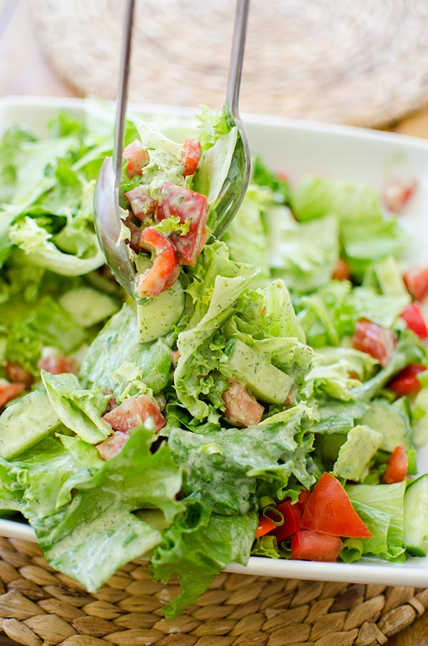 For this dressing, I like to serve a simple salad of romaine or spinach with bell pepper, cucumber and green onions but this tofu salad dressing would work really well with pretty much all greens and vegetables. I actually think thatΒ this would beΒ incredibleΒ with zucchini noodles! You’ll have to let me know if any of you try that out, I think that’s a dish I’ll be enjoying this weekend. Be sure to follow me on Instagram and Snapchat to keep up with my every day life.