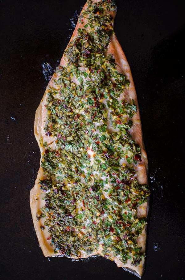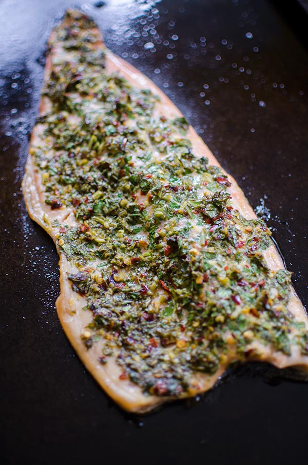 I typically go more of the Asian route when I’m cooking trout or salmon. I find it just goes so well with sesame oil, ginger and soy sauce! When I was deciding what kind of recipe I wanted to make with these beautiful fillets of trout, I challenged myself to go in a different direction. I started with a beautiful bunch of parsley that I had in the fridge and went from there, adding some lemon zest and chili flakes for a touch of heat.