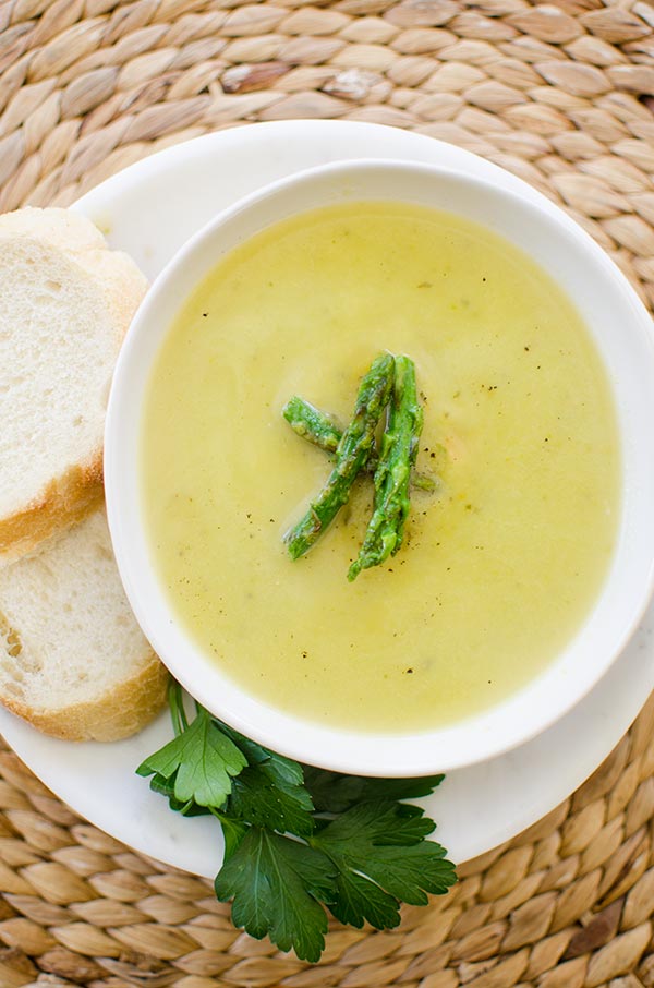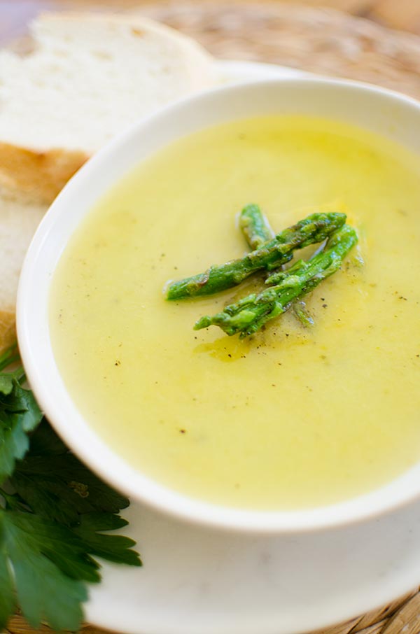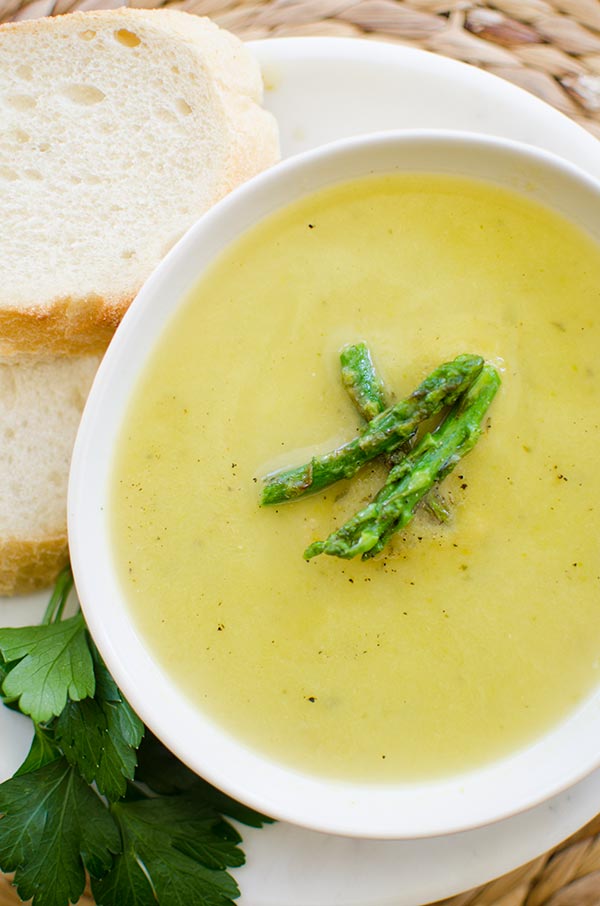 Light asparagus soup recipe with leeks, parsley and garlic without the addition of cream.