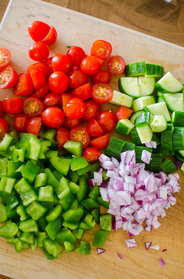The dressing is the star of the show here and I was inspired by my favourite Greek salad recipe and opted to use dried herbs like they traditionally do in salads in Greece. The dressing is a simple combination of olive oil, red wine vinegar, salt, pepper, garlic and dried oregano.