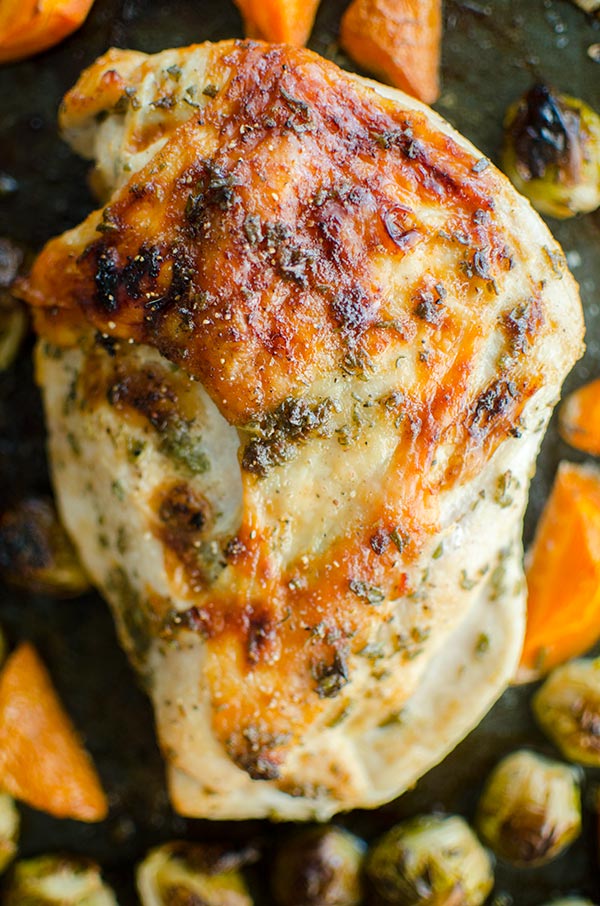 The veggies are roasted in olive oil with a little extra sage and salt. Everything cooks in one pan in the same amount of time, so you end up with perfectly caramelized Brussels sprouts and tender carrots.
