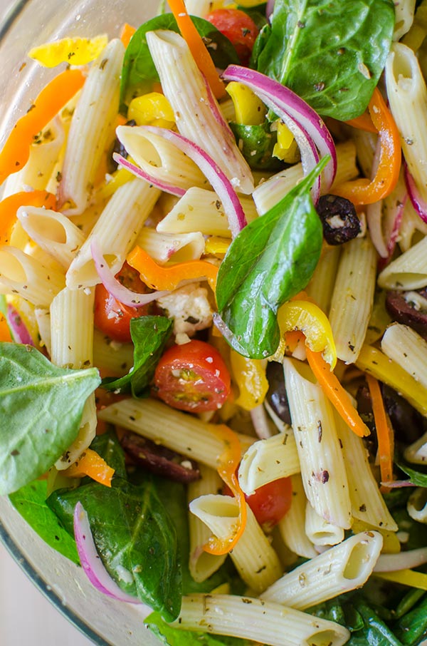 Most pasta salads hold up pretty well in the fridge for a few days, but because this recipe uses spinach, I find that it’s best within the first two of days, otherwise the spinach will begin to get a little soggy. Another option would be to leave the spinach out until just before serving, that way you completely avoid the potentially soggy spinach situation.