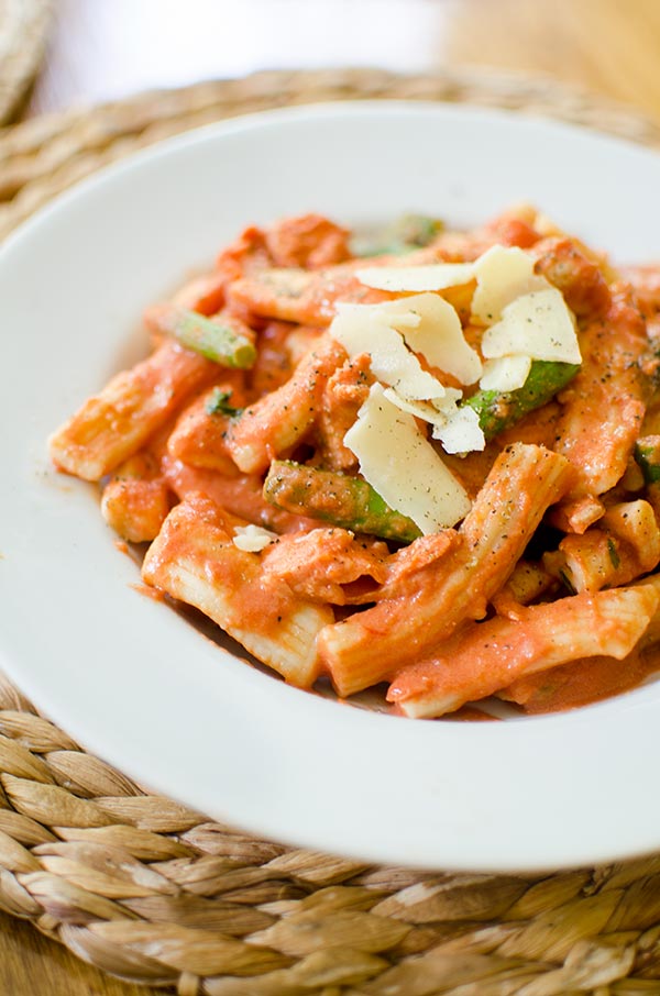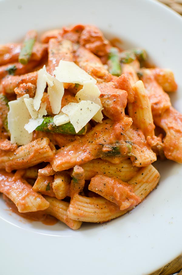 A delicious pasta with salmon and asparagus in a creamy rose sauce topped with Parmesan.
