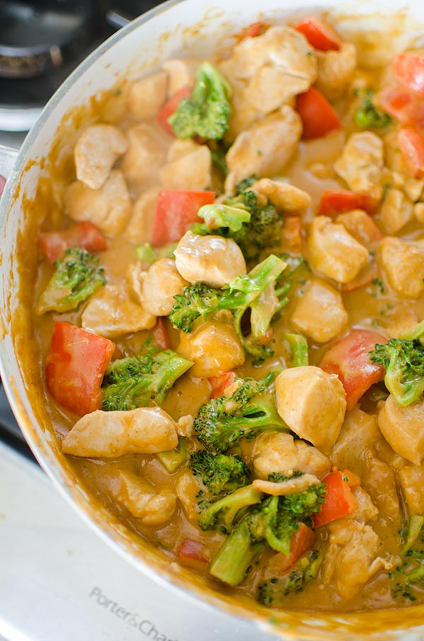 A quick dinner recipe for peanut chicken stir fry with a creamy coconut peanut sauce, broccoli and red peppers.