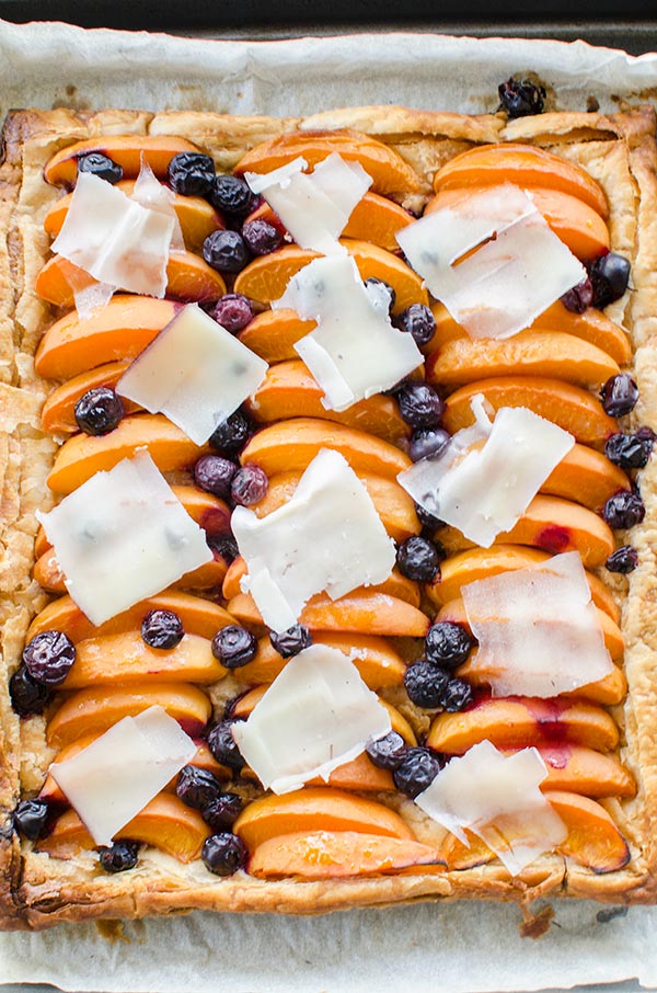 For this dessert recipe, I was inspired by the creativity of Canadian cheese with Dairy Farmers of Canada and the newest featured cheese of the month, Tipsy. This is an artisanal washed-rind cheese soaked in a Cabernet Merlot. These are the kinds of specialty cheeses you can find locally sourced all over Canada (this is from Gunn’s Hill Artisan Cheese in Oxford County, Ontario). The sweet and creamy cheese with its edible, wine-soaked rind is the ultimate way to elevate this puff pastry apricot blueberry tart.