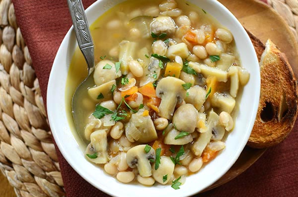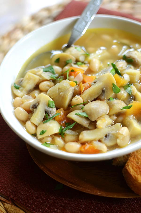 This vegetarian recipe for roasted garlic, mushroom and white bean stew is the perfect recipe for cooler weather with carrots and rosemary.
