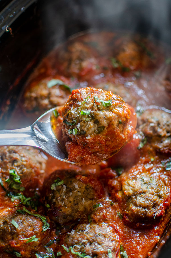 The meatballs are gently simmered in the crockpot and the tomato sauce becomes luscious and rich. I like to use mixture of lean ground beef and pork for these so that the sauce doesn’t become greasy.