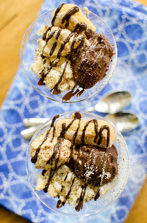 These tiramisu pudding parfaits were inspired by mixing together my current favourite dessert (tiramisu) and my childhood favourite, chocolate pudding. It’s a deconstructed dessert; lady finger crumbs make up the base, and then it’s topped with a scoop of a high quality pudding (I’m really excited about these new HERSHEY Pudding Cups), a scoop of homemade coffee whipped cream, drizzled with chocolate sauce and then topped with one last lady finger cookie