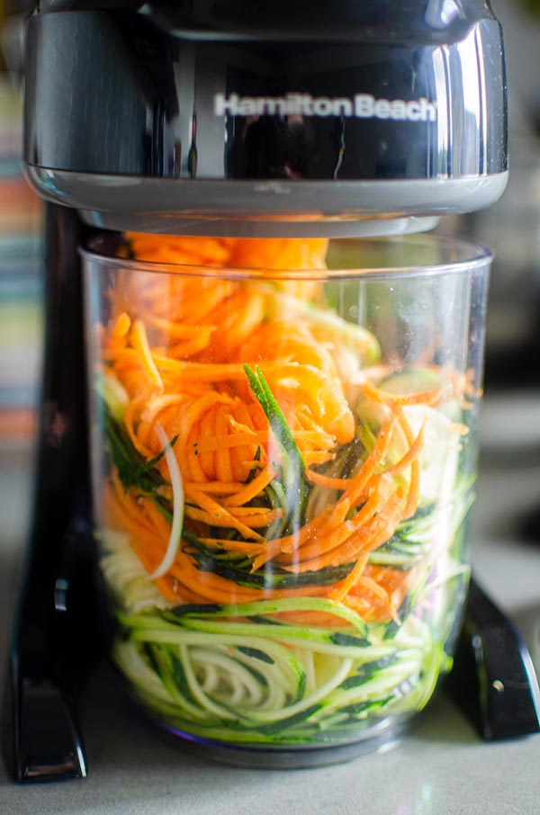 Hamilton beach 4-in-1 electric spiralizer spiralizing zucchini and carrots into noodles