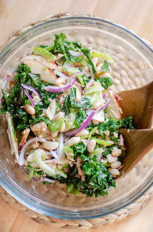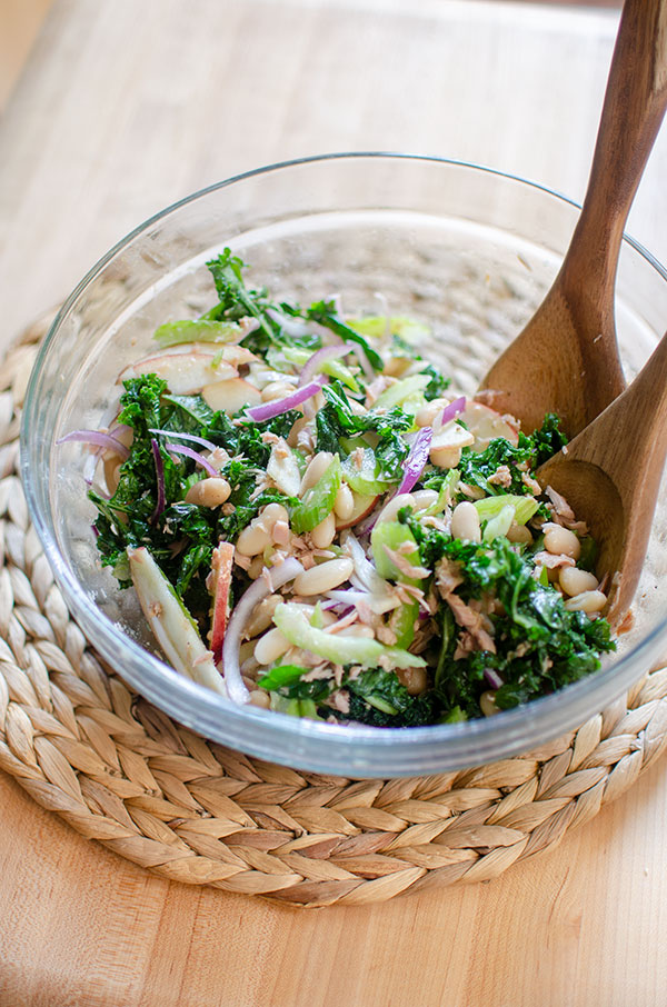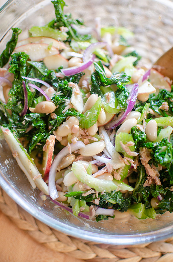 • Toss massaged kale with white beans, tuna (and its oil), celery, apple and red onion.